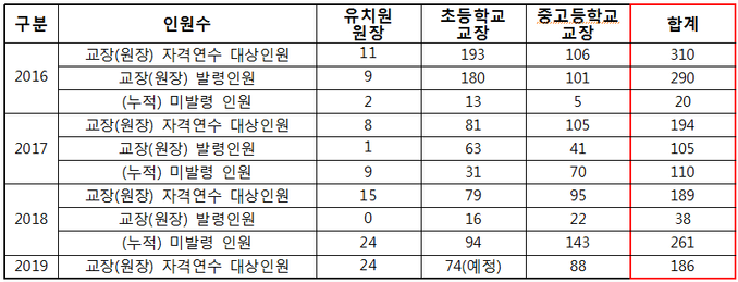 ▲ 최근 4년간(2016~2019) 교장 및 원장 자격연수 현황. (2019년 3월 1일 기준) |
