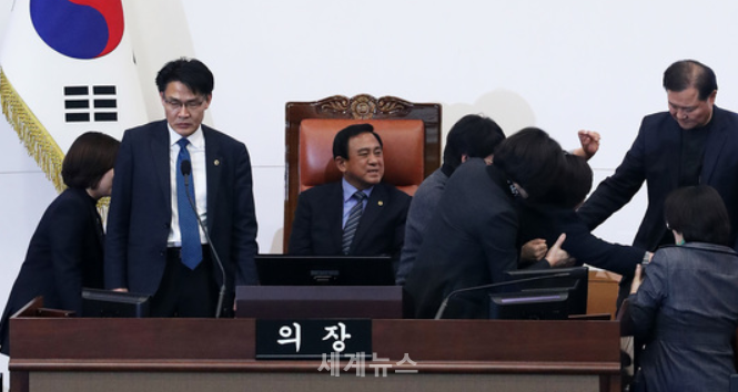 ▲ [세계뉴스] 조홍식 기자 = 20일 오후 서울시의회 본회의장에서 열린 제279회 임시회 제1차 본회의에서 더불어민주당과 자유한국당 소속 의원들이 4인 선거구 확대를 요구하며 의장석을 점거한 바른미래당과 민주평화당 소속의 동료의원들을 끌어내고 있다. 양준욱 의장이 의장석에 앉은채로 그 광경을 지켜보고 있다. 서울시의회는 6·13 지방선거를 앞두고 추진됐던 서울시 기초의회 4인 선거구 신설은 더불어민주당과 자유한국당의 힘에 부딪쳐 끝내 무산됐다. |