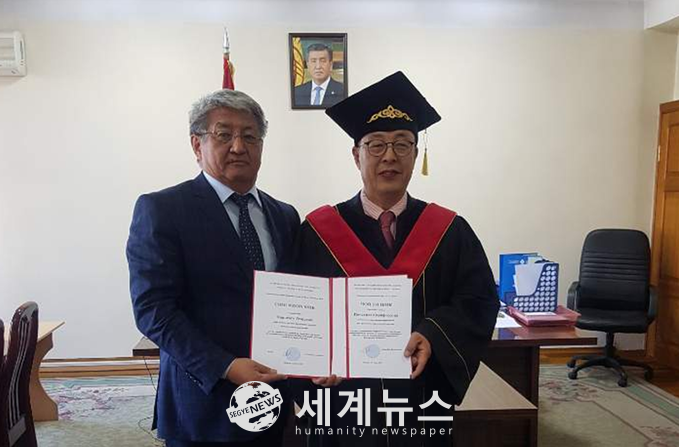 [세계뉴스 전승원 기자] 서울특별시의회 최웅식 의원(더불어민주당·영등포1)이 키르기즈공화국 대통령 소속 행정아카데미에서 지난 28일(현지시간) 명예 정치학박사 학위 수여와 명예교수 임명장을 받았다.