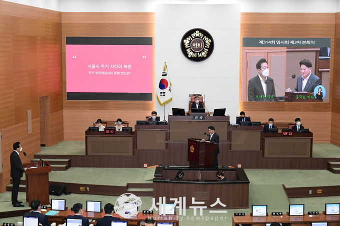 ▲ 서울시의회 홍국표 의원이 오세훈 시장을 상대로 시정질문을 통해 서울시 반지하 거주민 지원 대책의 실효성 부족을 지적하고 주거 취약계층을 위한 도시개발 및 정비사업 활성화를 위한 고도지구 완화를 제안하고 있다. |
