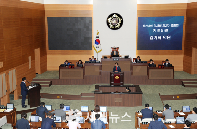 ▲ 김기덕 서울시의원이 제283회 임시회 제2차 본회의에서 박원순 서울시장을 상대로 시정질문을 하고 있다. |
