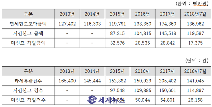 강 의원은 “면세한도초과분에 대한 자진신고건수가 크게 늘어난 데에는 자진신고에 따른 인센티브 제도가 역할을 한 것으로 보인다”며 “자진신고에 따른 인센티브제도의 홍보를 강화하는 한편, 미신고에 대한 단속과 처벌을 강화해 부당한 관세포탈이 발생하지 않도록 해야 한다”고 말했다.
