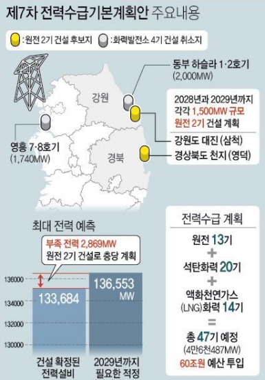 정부는 전력수급 계획에 따라 앞으로 원전 13기, 석탄화력 20기, 액화천연가스(LNG)화력 14기 등 총 47기(4만6천487MW)의 발전소를 건설하는 데 60조원의 예산을 투입할 계획이다.