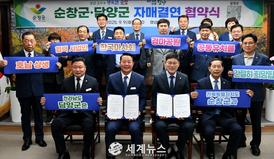 [세계뉴스 = 양경희 기자] 전라남도 담양군(군수 정철원)과 전북특별자치도 순창군(군수 최영일)은 9일 순창군 영상회의실에서 자매결연 협약을 맺고 상생발전과 우호교류 강화를 약속했다.