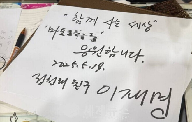 이재명 후보가 19일 정청래 의원의 지역구인 홍대의 한 식당에 남긴 사인에는 "응원합니다. 정청래 친구 이재명"이라고 적혀 있다. 이를 본 정 의원은 "대통령이 되면 전화하기도 어렵고 소주 한잔하기도 힘들 테니 친구를 잃을 것 같은 기분이 든다"며 "이제 이별 연습도 같이 해야 하는가"라고 시원섭섭함을 표했다.