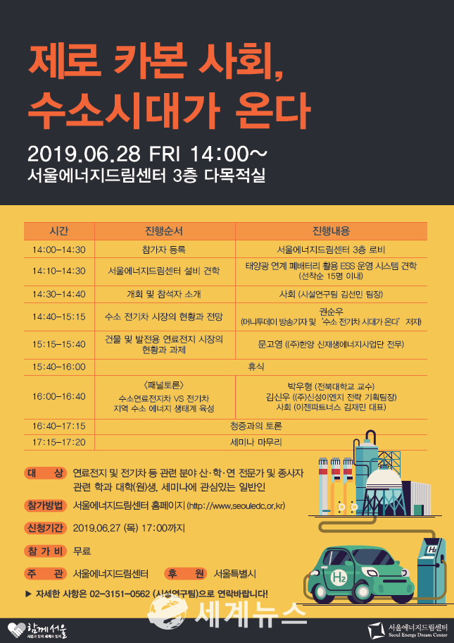 [세계뉴스] 윤소라 기자 = 서울에너지드림센터는 오는 28일 오후 2시 상암동 평화의 공원 내 위치한 센터 다목적실에서 “제로 카본 사회 - 수소시대가 온다”를 주제로 상반기 정기 세미나를 개최한다고 밝혔다.