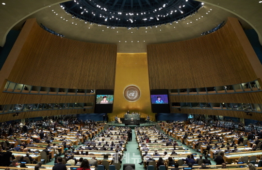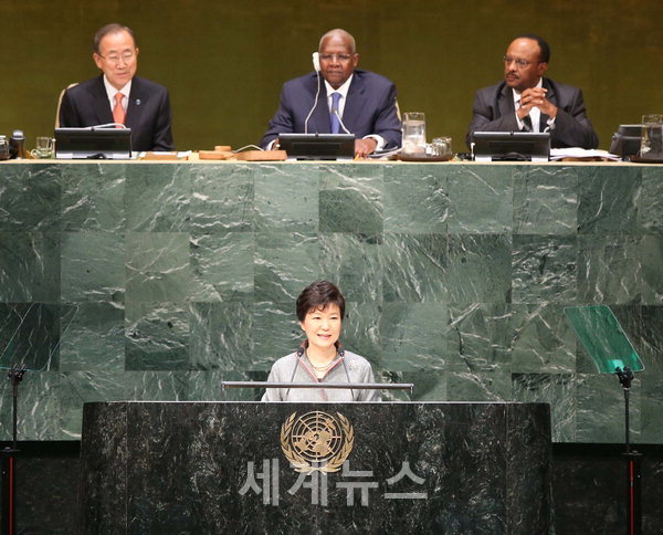 ▲ 박근혜 대통령이 유엔 개발정상회의 본회의에서 9번째 기조연설자로 나서 연설하고 있다. © 세계뉴스 |