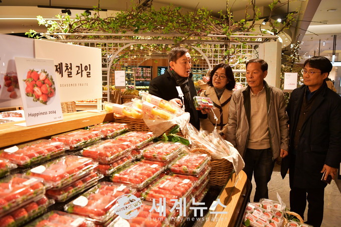 ▲ 이병노(왼쪽) 담양군수가 현대백화점 판교점을 방문해 담양 신품종 딸기인 ‘메리퀸’를 소비자들에게 홍보하고 있다. |