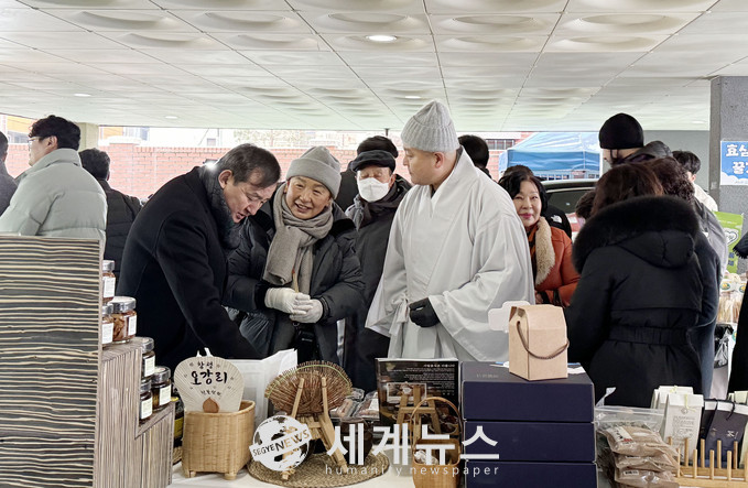 ▲ 이병노(왼쪽) 담양군수가 서울 조계사 직거래 장터를 방문해 담양군 5개 업체가 참여한 70여 개 품목의 담양 농특산물 판촉을 하고 있다. |
