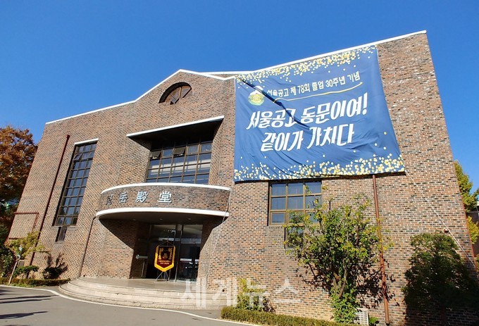 ▲ 서울공고 '관악강당' 담벽에 서울공고 제78회 졸업 30주년을 기념하는 "서울공고 동문이여! 같아가 가치다" 현수막 내걸고 은사와 동문들을 맞이했다. © 세계뉴스 |