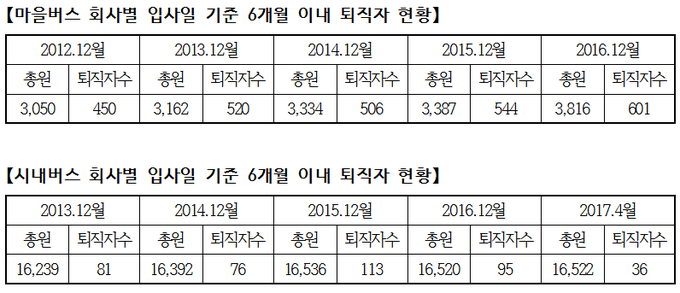 김 의원은 “마을버스에서 입사후 6개월 이내 퇴직자는 2012년 450명, 2013년 520명, 2014년 506명, 2015년 544명, 2016년 601명이고, 시내버스에서 입사후 6개월 이내 퇴직자는 2013년 81명, 2014년 76명, 2015년 113명, 2016년 95명, 2017년 4월 현재 36명에 달하고 있다”고 밝혔다.