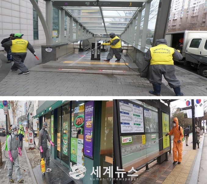▲ 성동구도시관리공단이 코로나19 확산 방지를 위한 지하철, 버스승강장, 가게 앞 등 방역활동을 실시하고 있다. |