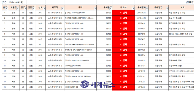 [세계뉴스] 정서영 기자 = 지난 3년간 서울시 교육청 관내 학교 급식실에 설치된 2,500만원에서 3,000만원 이상 고가의 ‘스마트세척기’ 전부가 특정 업체인 ‘ㄷ’사의 제품으로만 구매된 것으로 확인 됐다.