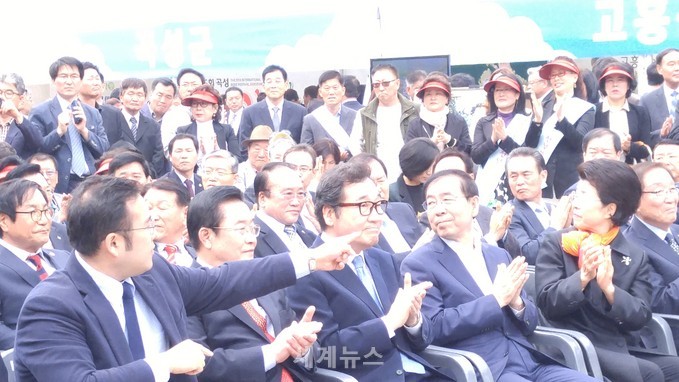 ▲ 2016광주전남 귀농귀촌 박람회에 참석한 내외빈소개로 왼쪽부터 (앞줄) 이재욱 전남일보 사장, 김정열 광주전남향우회장, 이낙연 전남도지사, 박원순 서울시장, (두번째줄 3번째) 이은성 재경담양군향우회장이 박수로 답례하고 있다. © 세계뉴스 |