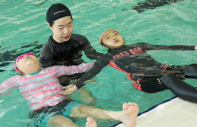 ▲ 국립중앙청소년수련원 생존 수영 교육에 참여한 천안 성남초 청소년들이 물속에서 잎새뜨기 수영법을 배우고 있다. (사진=국립중앙청소년수련원 제공) |