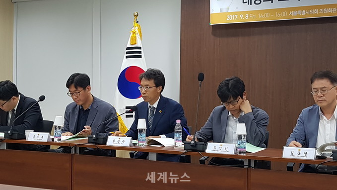 ▲ 지난8일 "서울시 태양광 보급 확대를 위한 실현 계획 및 과제"를 주제로 토론회가 열린 가운데 김광수 서울시의원(가운데)이 발표하고 있다. © 세계뉴스 |