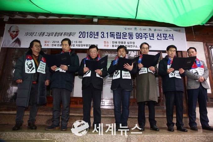 [세계뉴스] 윤소라 기자 = 한용운의 도시 서울 성북구에서 ‘3.1운동 99주년 기념 선포식’이 1일 진행됐다. 선포식에는 만해 한용운 선양사업 지방정부 행정협의회 관계자 및 주민 등 100여 명이 참석했다.