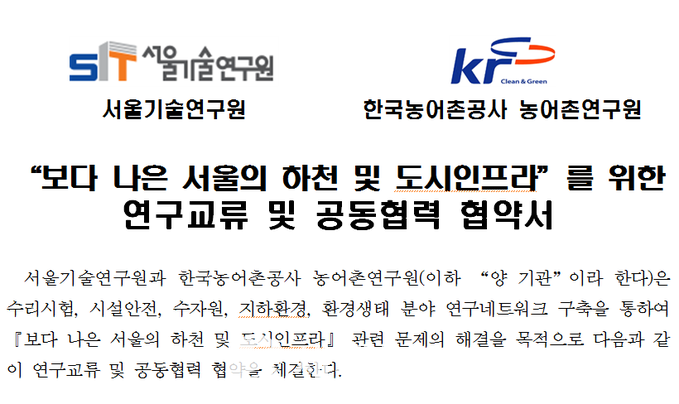 ▲ 서울기술연구원과 한국농어촌공사 농어촌연구원이 ‘보다 나은 서울의 하천 및 도시인프라’를 위한 기술개발 및 연구네트워크 구축을 위해 연구협력 MOU를 체결했다. |