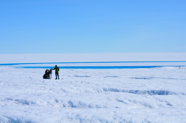 그린란드 서부 해안 가까운 1000m 깊이의 빙상 위에 형성된 노스 레이크에서 그런 현상이 2006년 7월 발견돼 과학자들을 놀라게 했다. 얼음 위에 깊이 10m에 이르는 파란 물이 폭 3㎞의 호수에 담겨 있었다.