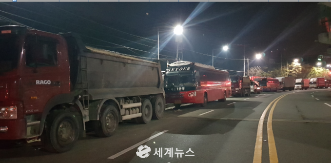 ▲ 한 대로변에 중대형트럭 등 덤프트럭이 줄지어 늘어서 주차되어 있다. |