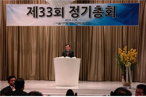▲ 26일 서울시 자동차검사정비사업조합 정기총회에 참석 축사를 하고 있다. © 세계뉴스 |