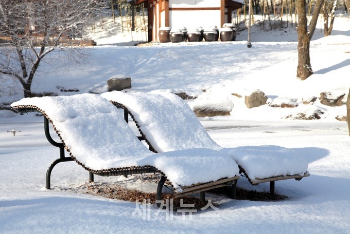 담양 죽녹원 시가문화촌 연못까지 하얀 눈으로 덮이며 이색 장관을 연출하고 있다. 추월당 한옥카페를 지나 소복하게 쌓인 눈으로 흰백의 침대를 연상케 하는 대나무 의자가 보인다. 왠지, 눕기만 하면 금방이라도 잠이 들 것 같다. 우송당 처마 밑에는 애기 고드름이 쪼르륵 매달려 있다.