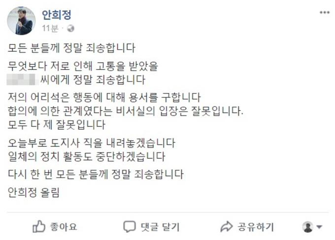 안 지사는 6일 오전 자신의 페이스북을 통해 “오늘부로 도지사직을 내려놓겠다. 일체의 정치 활동도 중단하겠다. 모든 분들께 정말 죄송하다”라고 밝혔다.