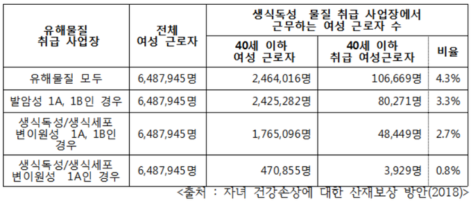 고용노동부가 우송대학교 산학협력단에 의뢰한 ‘자녀 건강손상에 대한 산재보상 방안(2018)’ 연구용역 보고서를 보면, 인구총조사에 따른 전체 여성노동자는 6,487,945명이고, 가임기 여성 노동자(40세 이하)는 3,540,575명, 이 중 출산계획이 있는 노동자는 1,038,214명으로 추산된다. 이 중 생식독성 유해물질에 노출되는 사업장에 근무하는 가임기 여성은 2,464,016명이고, 이러한 물질을 취급하는 여성노동자는 106,669명로 추산했다. 생식독성의 위험성이 큰 생식독성/생식세포 변이원성 1A을 취급하는 40세 이하 여성노동자도 3,929명이나 되는 것으로 나타났다.