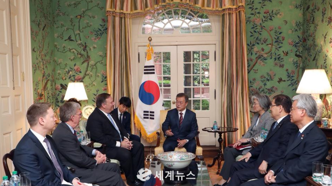 ▲ 미국을 방문중인 문재인 대통령이 폼페이오 국무장관과 존 볼튼 국가안보보좌관을 접견하고 있다. (사진=청와대 제공) |