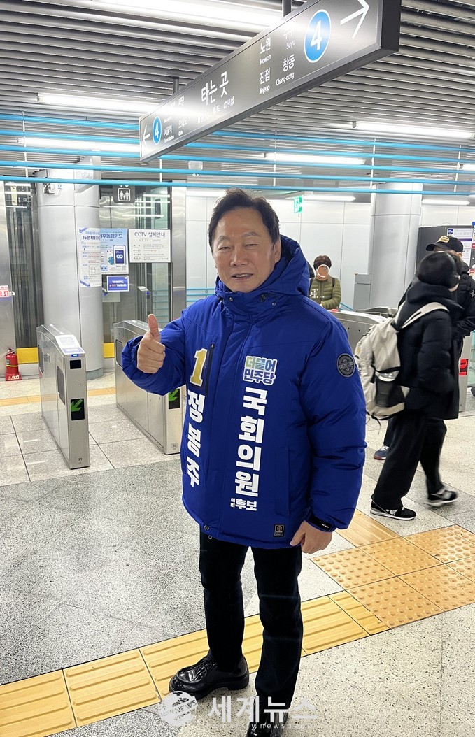 ▲ 더불어민주당 정봉주 예비후보가 지하철역에서 선거유세 중 엄지척을 보이고 있다. |