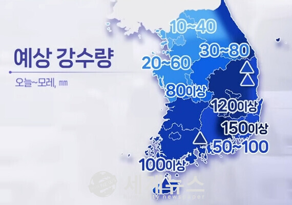 기상청에 따르면 13일 저녁까지 제주와 남해안, 호남 지역에 시간당 최대 30㎜ 이상의 비가 내릴 것으로 예상되며, 14일 아침까지는 영남지역에 최대 150㎜ 이상의 많은 비가 올 가능성이 있다. 시간당 강수량은 최대 30~50㎜에 달하며, 일부 지역에서는 시간당 50㎜ 이상의 강수도 예상된다.