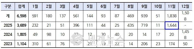 최근 3년간 월별 특정장애인단체 민원 접수현황(공사 고객센터 기준).