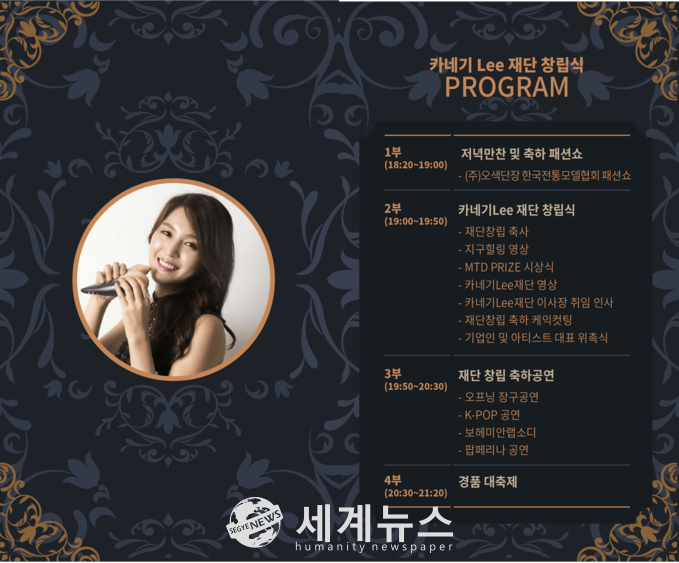 한편 ‘카네기Lee 재단’ 창립식의 MC는 배한성 아나운서가 맡아 3부 행사로 1부 저녁만찬 및 (주)오색단장 한국전통모델협회 패션쇼가 진행되며, 2부는 재단 창립 이예영 초대 이사장의 인사말씀과 축사 등 MTD PRIZE시상식, 기업인 및 아티스트 대표 소개와 위촉식을 진행한다. 재단 창립 축하공연으로 오프닝 장구 공연과 팝페리나, 보헤미안랩소디, 유명가수의 공연이 펼쳐진다. 3부는 경품 대축제와 폐회식을 끝으로 재단 창립식은 종료한다.