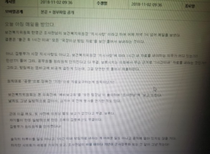 보건복지위원회 한영근 조사관님이 보건복지위원장 ‘지시사항’ 이라고 하여 어제 저녁 7시 넘어 메일을 보냈다.