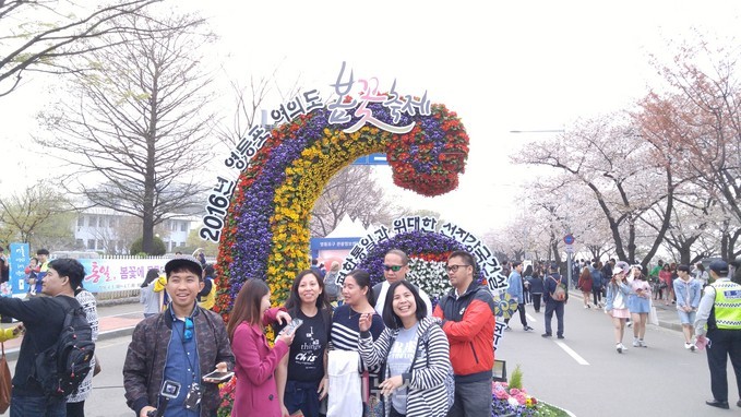 ▲ 여의도 봄꽃축제 조형물 앞에서 동남아에서 온 관광객들이 사진 포즈를 취하고 있다. © 세계뉴스 |
