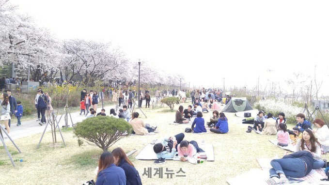 ▲ 9일 주말을 맞아 봄꽃구경에 나선 시민들이 한강 둔치에서 휴식을 취하고 있다. © 세계뉴스 |