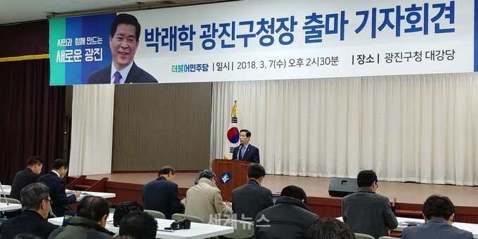 ▲ 박래학(더불어민주당) 전 서울시의회 의장이 7일 오후 광진구청 별관 대강당에서 광진구청장 출마를 선언했다. © 세계뉴스 |