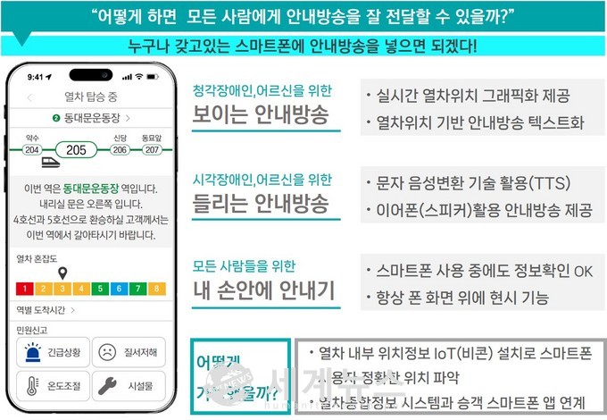 청각장애인을 위해 ‘보이는 안내방송’으로 정보를 시각화했으며, 시각장애인에게는 문자 음성변환(TTS) 기술을 통해 ‘들리는 안내방송’을 제공한다.