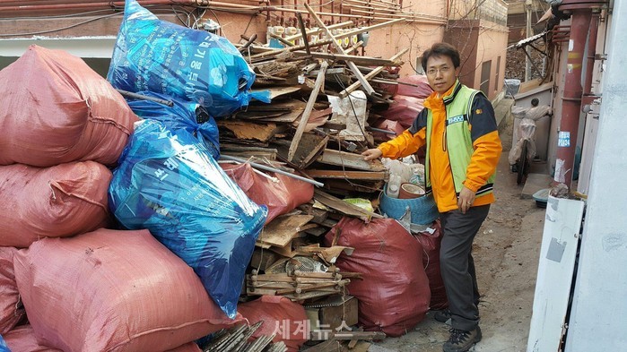 ▲ 수암사랑나눔이 봉사단원들이 골목길 쓰레기 더미를 치우고 있는 모습. © 세계뉴스 |