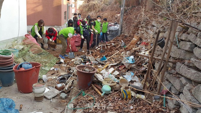 이날 사무실에 모여든 수암사랑나눔이 봉사단은 오후3시 현장에 도착해 산더미처럼 쌓인 쓰레기 더미와 사투를 벌여야 했다. 백지장도 맞들면 났다고 했던가? 쓰레기 더미와 씨름을 해가며 일을 시작한지 3시간 30분이 지나서야 골목이 밝아 보이기 시작했다.