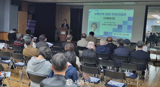 ▲ 김기덕 서울시의원이 마포구 상암동 주민센터 강당에서 대장홍대선, 강북횡단선, DMC 랜드마크, 서부면허시험장, DMC역 복합개발, 상암복합쇼핑몰, 상암산 책쉼터, 마포 쓰레기 소각장 추가건설 백지화 추진 등 현재 마포구 상암동 일대 대표적인 지역현안에 대한 주요 사업을 중심으로 시정보고회를 진행하고 있다. |