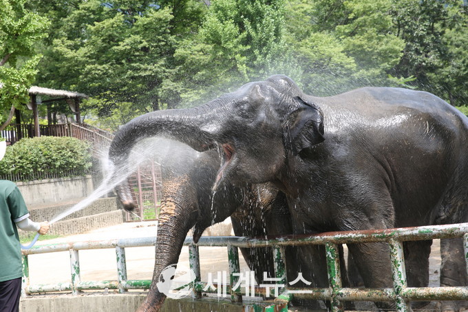 [세계뉴스] 윤소라 기자 = 열대지역에 서식하는 아시아코끼리가 서울대공원의 사육사들이 뿌려주는 물줄기로 시원한 냉수 마사지를 하고 있는 코끼리가 폭염엔 장사없다 표정이다.