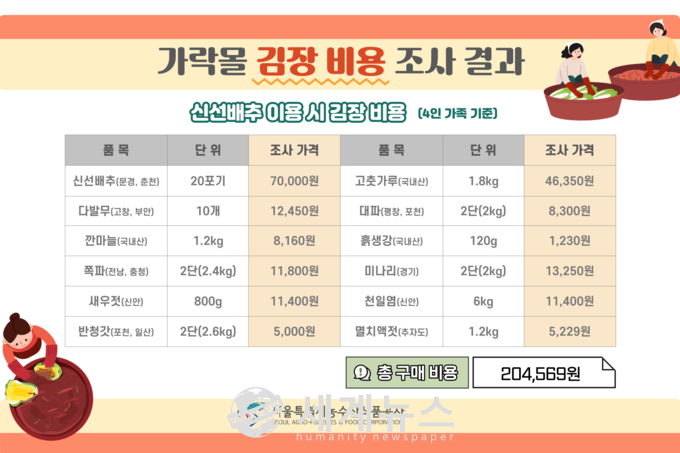 지난 6일 가락시장에 있는 가락몰 내 점포를 대상으로 주요 김장재료 12개 품목의 구매 가격을 조사한 결과, 신선배추를 이용하는 경우 204,569원이 소요되는 것으로 조사되었다.