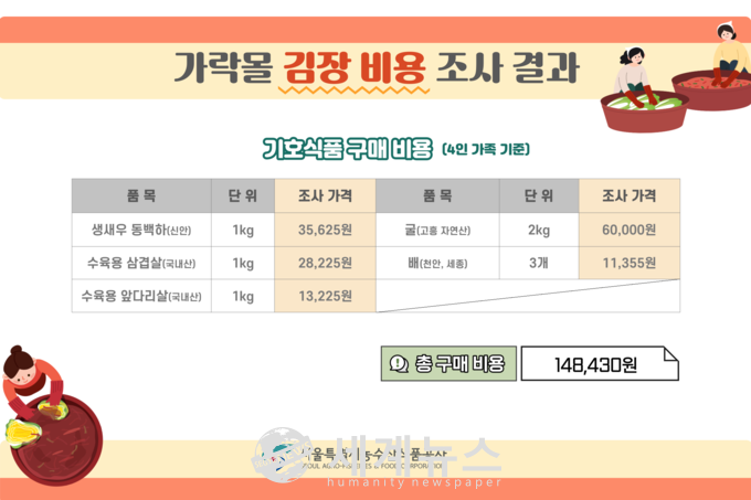 [세계뉴스 조홍식 기자] 서울특별시농수산식품공사(사장 문영표)는 김장철을 맞이하여 알뜰한 김장재료 장보기에 도움이 되는 정보를 제공하기 위해 가락몰 김장재료 구매가격 조사 결과를 발표했다.