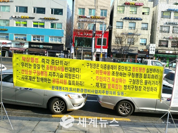 ▲ '문래동4가 도시환경정비사업 지주협의회'가 영등포구청 앞에 부당한 행정을 규탄하는 현수막을 내걸었다. © 세계뉴스 |