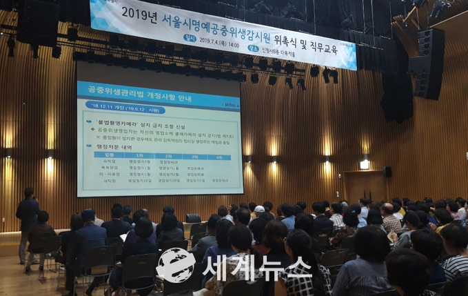 [세계뉴스] 윤소라 기자 = 서울시는 숙박, 목욕장, 이·미용업소 같은 공중위생업소의 효율적 위생관리를 위해 ‘명예공중위생감시원’ 285명을 위촉했다. 오는 10월 제100회 전국체전 개최를 앞두고 청결한 숙박시설 등 공중위생관리를 강화할 예정이다.