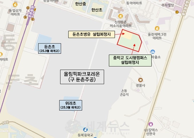 올림픽파크포레온 재건축정비사업 진행에 따라, 증가하는 학생들을 수용할 교육 기관 신설은 꾸준히 요구되어 왔었다. 이에 따라 강동송파교육지원청은 병설유치원 6학급을 포함한 (가칭)둔촌일초 신설을 추진하였으나, 2020년 12월 교육부 중앙투자심사 결과 부적정 판단을 받아 추진되지 못했다.