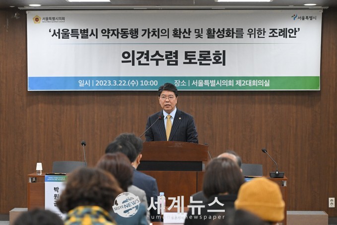 [세계뉴스 윤소라 기자] 서울특별시의회 도시계획균형위원회(위원장 도문열)는 22일 서울시 약자와의동행추진단과 공동으로 ‘약자동행’ 정책의 바람직한 추진 방향 정립과 발전적 미래상을 모색하기 위해 ‘서울특별시 약자동행 가치확산 및 활성화 조례안(이하 약자동행 조례안) 토론회’를 개최했다.