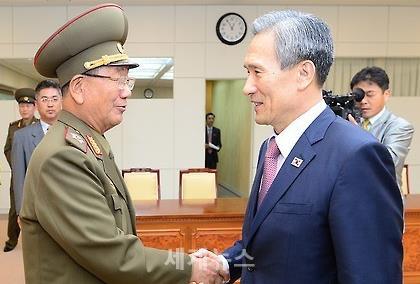 ▲ 회담을 마치고 악수하는 황병서 군 총정치국장(왼쪽)과 김관진 안보실장(오른쪽) © 세계뉴스 |