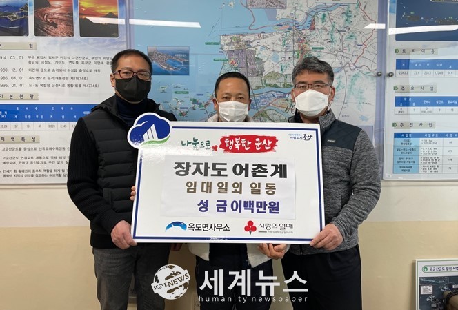 군산시 옥도면은 장자도어촌계(어촌계장 임대일)가 지난 29일 도서지역 어려운 불우가정 지원을 위한 불우이웃돕기성금 200만원을 기탁했다고 밝혔다.